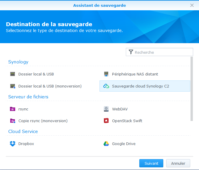 Synology offre l'opportunité d'utiliser une série de sites cloud pour sauvegarder vos données : Azure, Amazon Glacier mais également son propre service nommé Synology Cloud C2. C'est ce dernier que nous allons utiliser. Rappel : l'externalisation est très importante et constitue le dernier rempart contre le vol, l'incendie, les virus, ou vous ^_^.