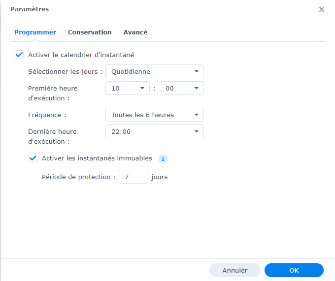 Si vous programmez vos instantanés, activez le calendrier pour que le rythme des snapshots corresponde à votre souhait.