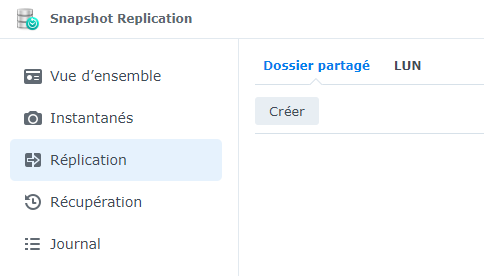cliquez sur Réplication et choisissez la réplication d'un instantané de dossier partagé ou de LUN. Faites Créer.