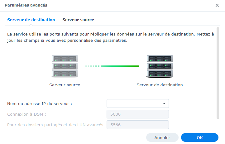 Entrez les informations de connexion du serveur de destination ainsi que les paramètres de ports permettant aux deux NAS de communiquer