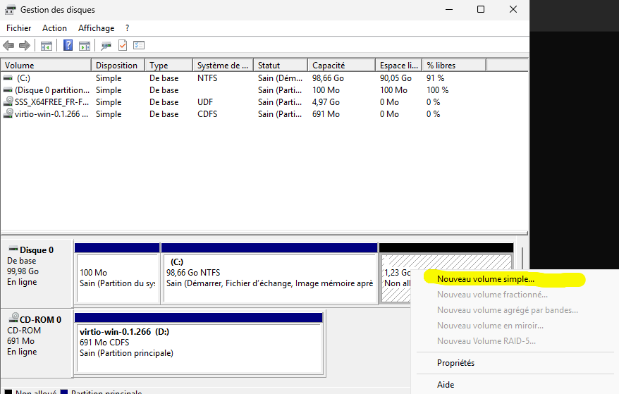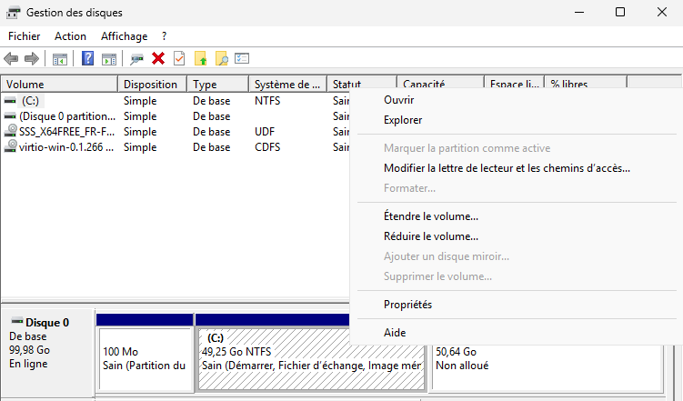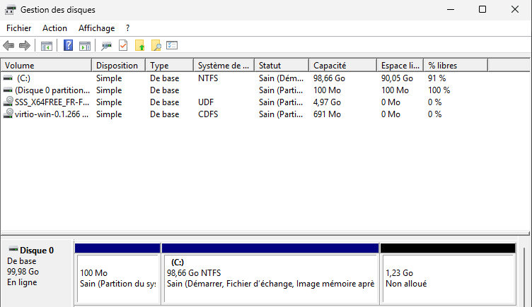 Après toutes ces manipulations, le gestionnaire de disques devrait afficher ce type d'information montrant que nous disposons