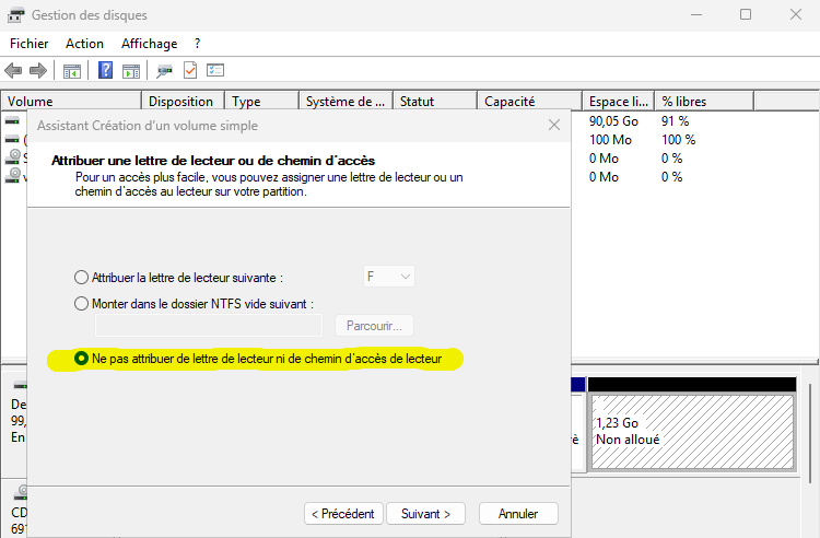Pour recréer la partition de récupération, nous définissons un nouveau volume simple sans lui affecter de lettre de lecteur