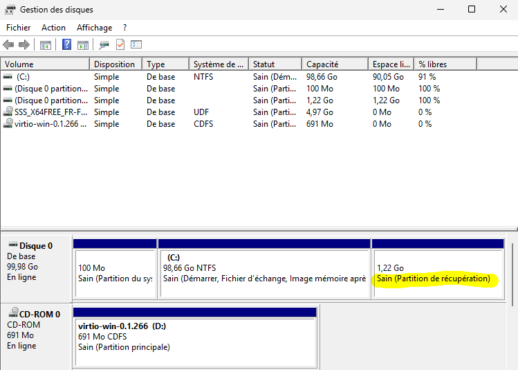 Comme on peut le voir ici, la nouvelle partition est de type Principale et non Récupération. Lancez les commandes suivantes