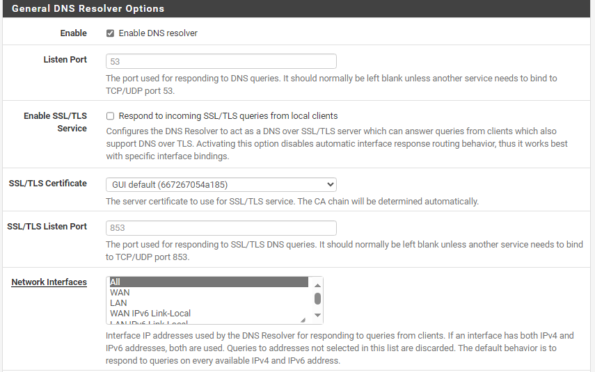 Le resolver DNS est en écoute par défaut sur l'ensemble des cartes réseaux du pfsense. Il n'est pas nécessaire d'apporter de modifications à ce niveau, sauf cas particulier pour isoler des sous réseaux.