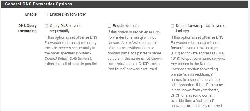 En fonction de votre configuration, les services DNS de pfsense sont configurés dynamiquement par le lien sur lequel le port WAN est connecté. Ainsi, si votre routeur est en DHCP, votre lien WAN offert par le pfsense vous renverra les DNS de votre fournisseur d'accès Internet (FAI). Ce n'est pas forcément ce qu'il y a de mieux à faire car ces serveurs DNS peuvent ^tre lents, filtrants ou loin de votre point de raccordement.