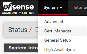 Une fois connecté à l'interface du pfSense, rendez-vous sur la page d'accueil Status / Dashboard.
