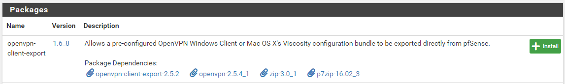 Cliquez sur + Install pour mettre en place le package d'export openvpn