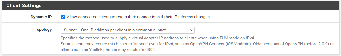 Dans les paramètres du client qui va utiliser ce tunnel, cocher Dynamic IP et laisser la topologie