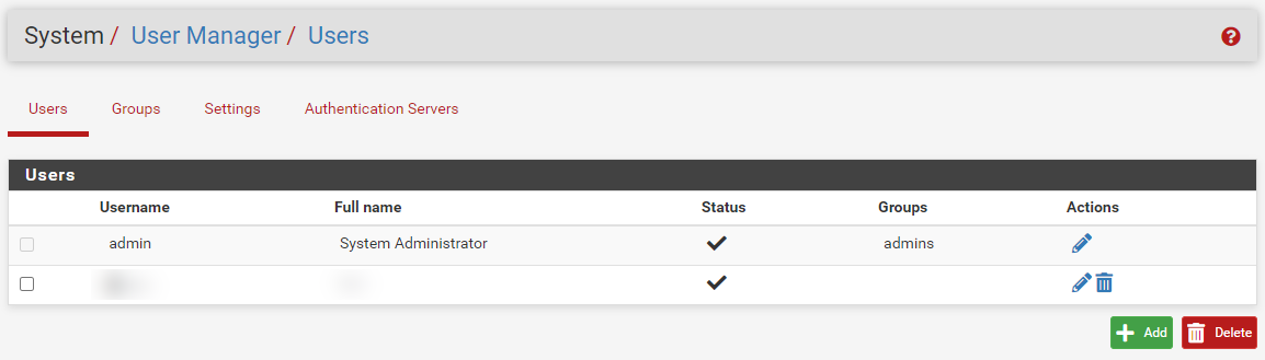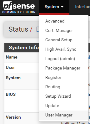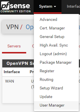 Un serveur VPN sans utilisatyeurs n'a que peu d'intérêt. Pour peupler votre serveur, rendez-vous sur System > User Manager