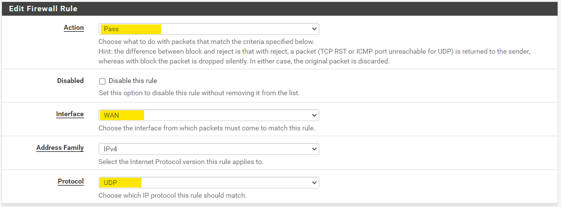 Il faut laisser passer le flux arrivant sur votre interface WAN (ou l'interface du CARP si jamais) et en spécifiant le protocole UDP.