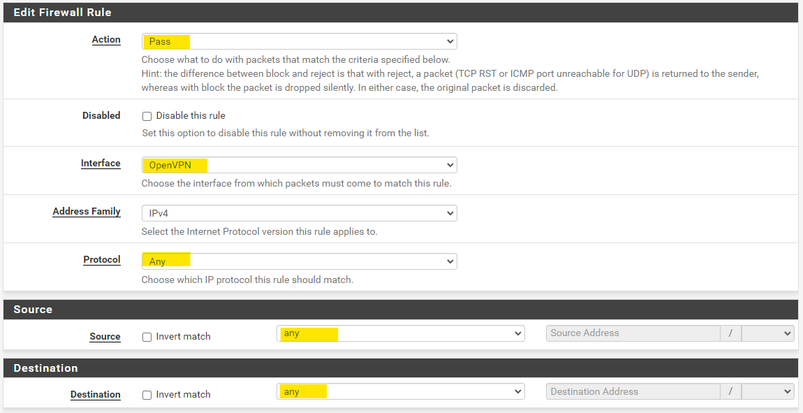L'objectif est de laisser passer n'importe quelle source arrivant sur l'adresse WAN du firewall et se présentant avec le port 1194.