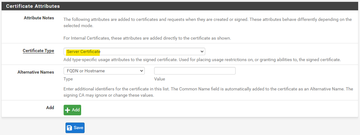 Dans la partie des attributs du certificat, nous allons créer un certificat pour notre serveur. Sélectionnez le type