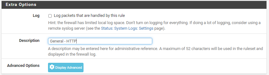 Dans la section Extra Options, il est conseillé de préciser une description pour la règle. Comme c'est une règle générale pour un flux