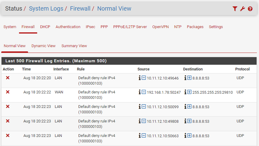 les logs du firewall afin de savoir si des règles matchent des flux. Rendez-vous sur Status > System Logs > Firewall pour