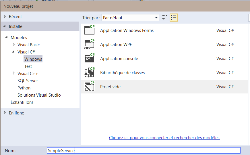 Nous allons commencer par créer un projet vide depuis Visual Studio Express. Nous lui donnons le nom de SimpleService pour ne pas faire trop compliqué...