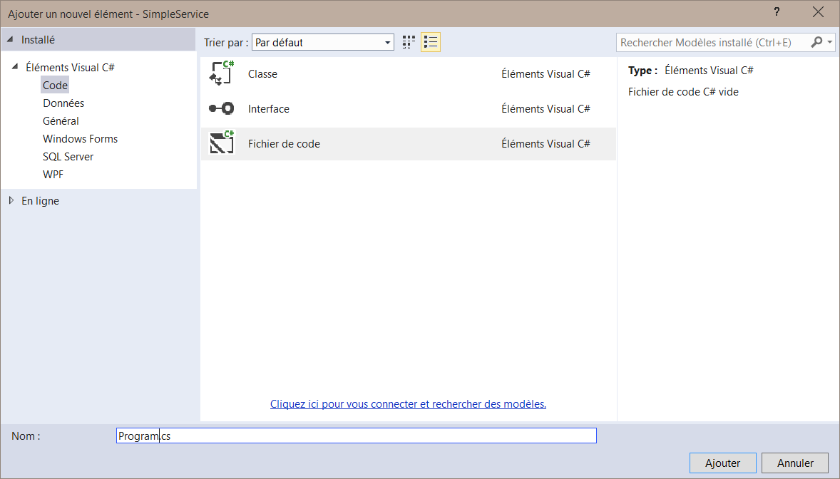 Ajoutez ensuite une feuille de code en cliquant droit sur le projet SimpleService et en faisant Ajouter > Nouvel élément..., vous choisissez Code > Feuille de code.