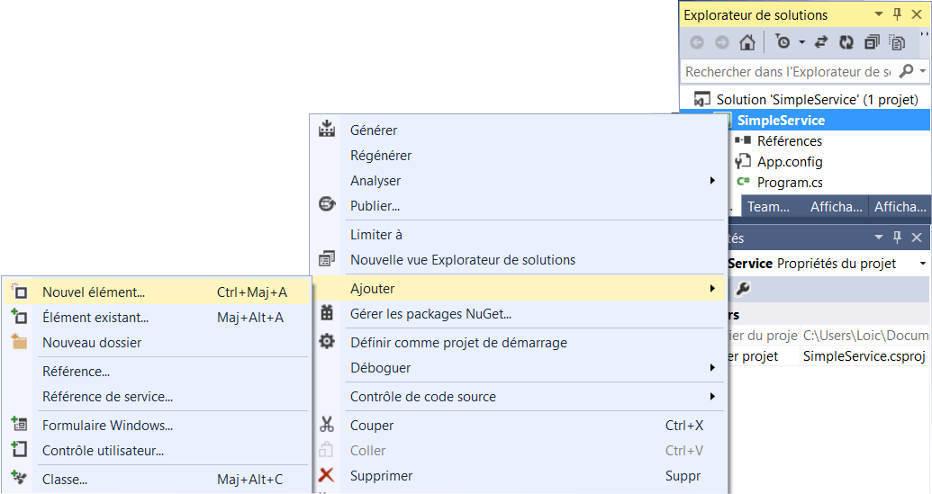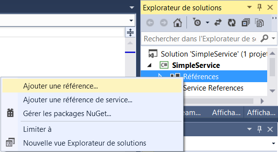Afin d'utiliser les différentes méthodes requises pour la mise en place d'un service, il faut ajouter des références au projet et les inclure dans le programme. Pour cela, commencer par faire un clic droit sur Project > Ajouter une référence...