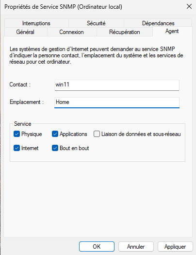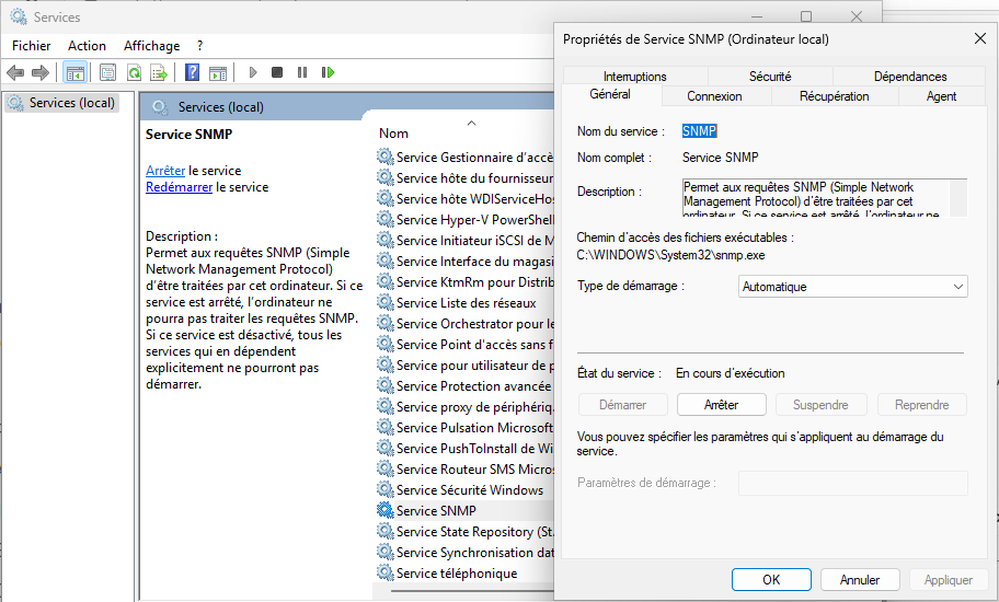 Suite à tout changement dans la configuration de SNMP, il faut bien penser à redémarrer le service SNMP.