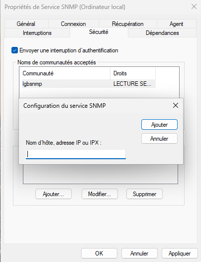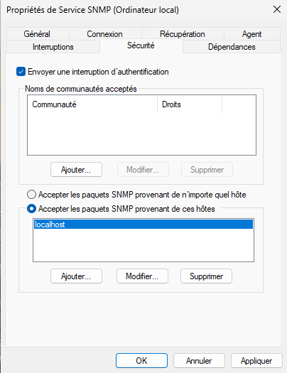 Pour vérifier vos configurations, vous pouvez ouvrir les services Windows (Win+R > services.msc), cliquer deux fois sur le service SNMP et valider vos configurations depuis l'onglet Sécurité.