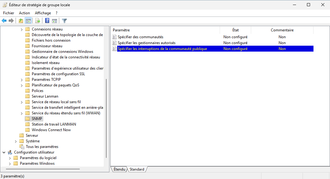 Une stratégie de groupe existe pour permettre de déployer rapidement dans un LAN la configuration SNMP pour les équipements avec lesquels SNMP doit interagir. Rendez-vous sur Stratégie ordinateur local > Configuration ordinateur > Modèles d'administration > Réseau > SNMP Renseignez les différents éléments et appliquez la GPO sur les serveurs concernés.