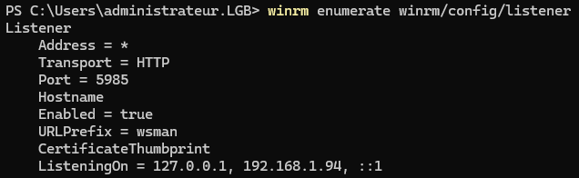 Afin de déterminer à qui vous pouvez envoyer des messages, il vous faut obtenir la liste des écouteurs WinRM avec la commande suivante :