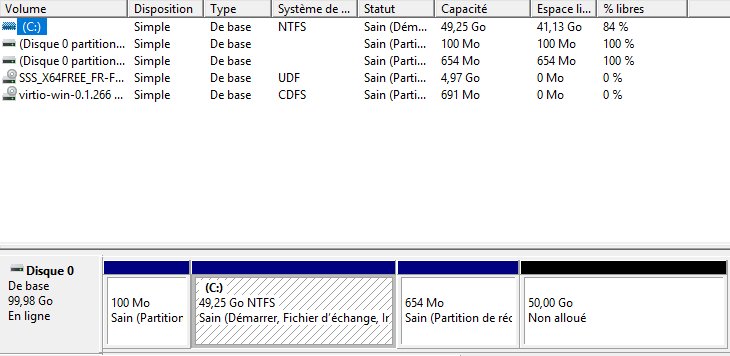 Après toutes ces manipulations, le gestionnaire de disques devrait afficher ce type d'information montrant que nous disposons