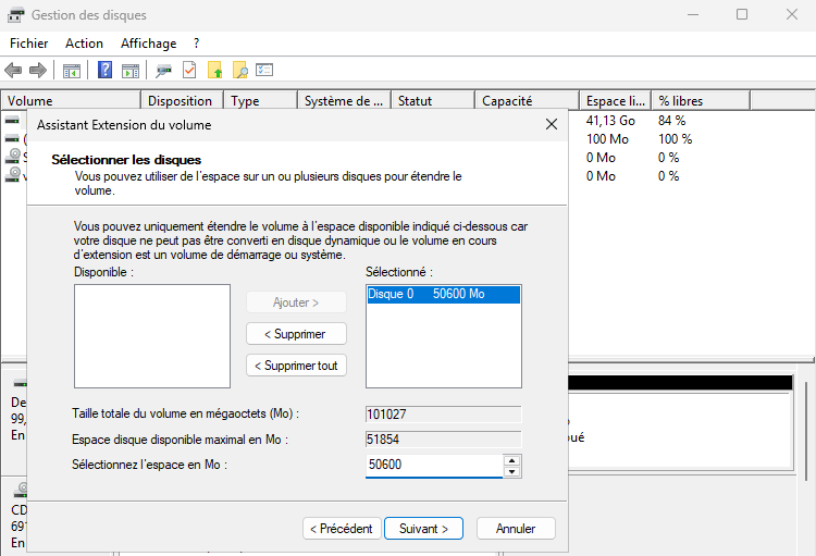 pouvons étendre cette partition par l'intermédiaire du gestionnaire de disques de Windows. Quand celui-ci est démarré, faites