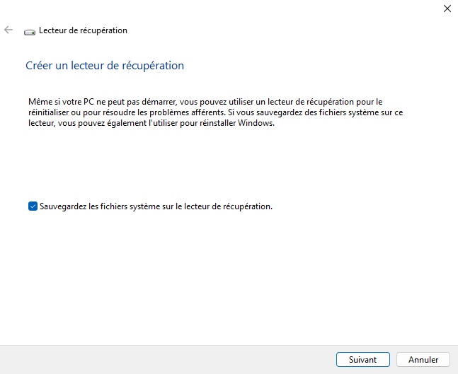 le Menu Démarrer. Cochez la case "Sauvegarder les fichiers système sur le lecteur de récupération" puis Suivant.