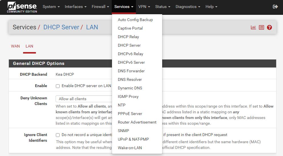 Le routeur est capable de jouer le rôle de serveur DHCP sur une ou plusieurs cartes réseau. Pour les réseaux Windows disposant d'un contrôleur de domaine, vous avez généralement plutôt intérêt à utiliser le service DHCP de Windows car il dispose de beaucoup plus d'éléments de configuration que pfSense. Mais en cas de besoin, ce service peut apporter une aide substantielle.