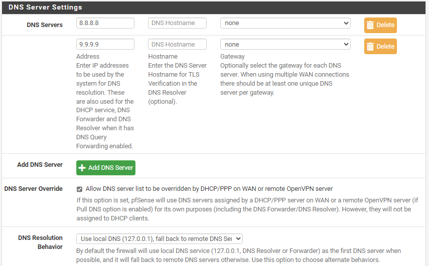 Si des serveurs DNS sont déclarés dans cette section, afin que le résolveur de pfsense puisse répondre aux requêtes locales, il faut revenir
