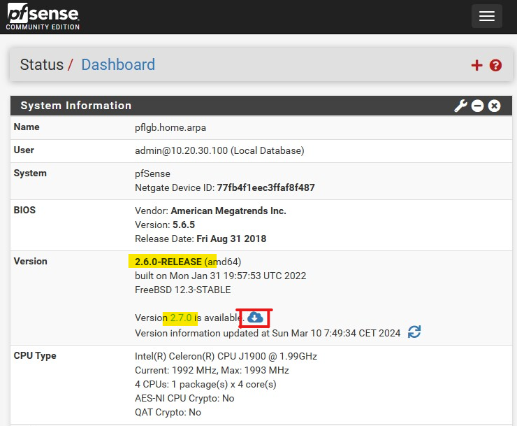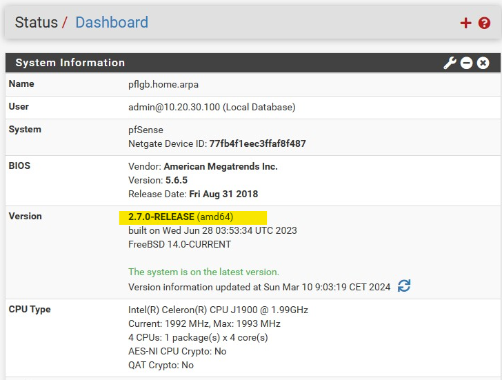 Une fois connecté à l'interface du pfSense, rendez-vous sur la page d'accueil Status / Dashboard.