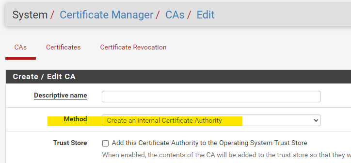 Dans la zone CAs, laisser la méthode à "Create an internal Certificate Authority" mais précisez un nom pour