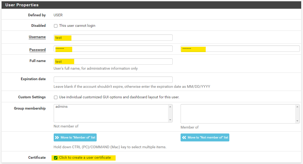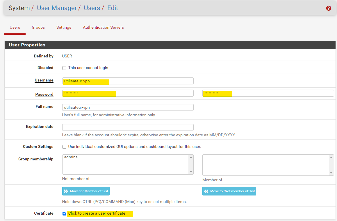 Un serveur VPN sans utilisatyeurs n'a que peu d'intérêt. Pour peupler votre serveur, rendez-vous sur System > User Manager