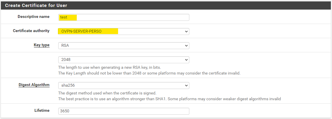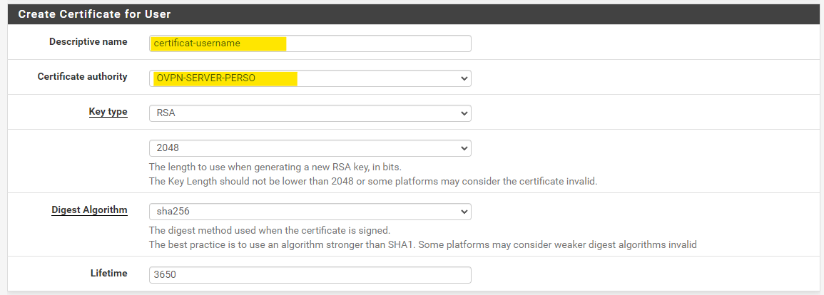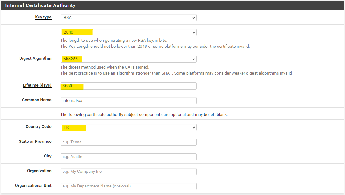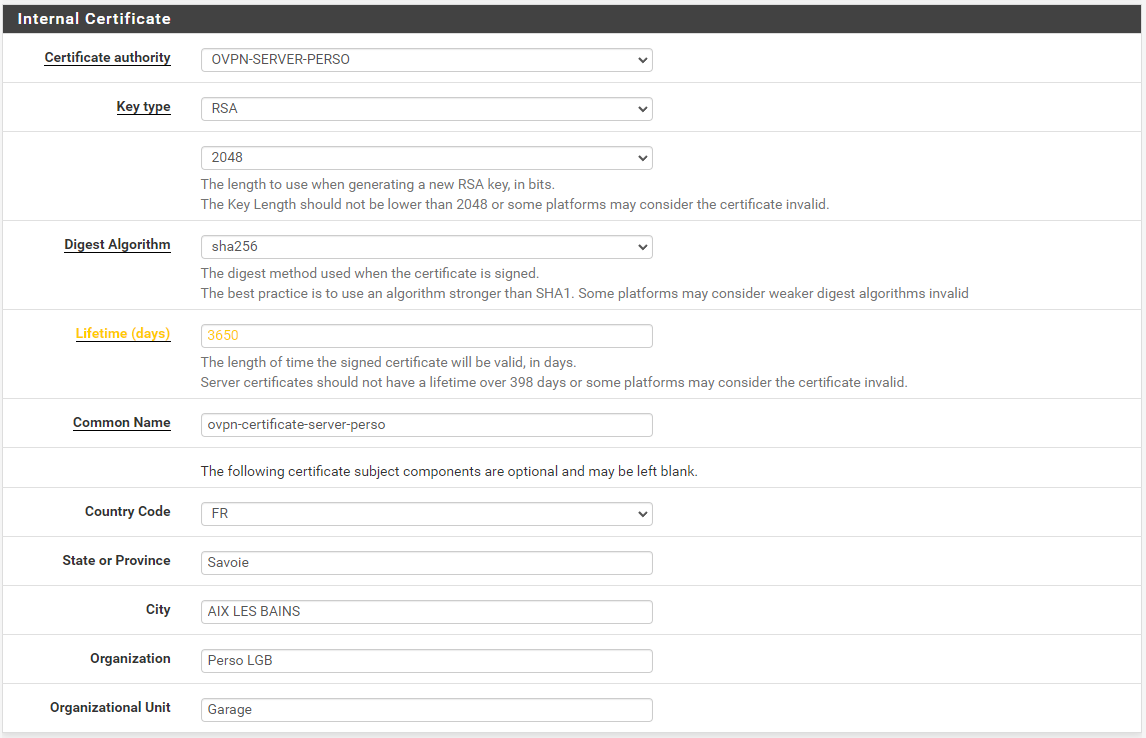 Le champ Common Name doit être unique et sans espace. Il va identifier le certificat.