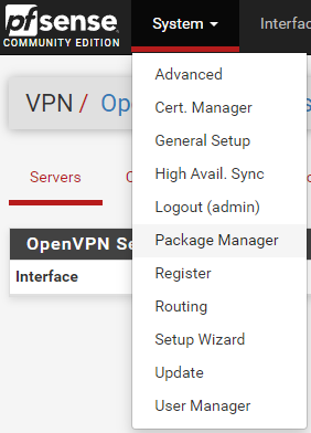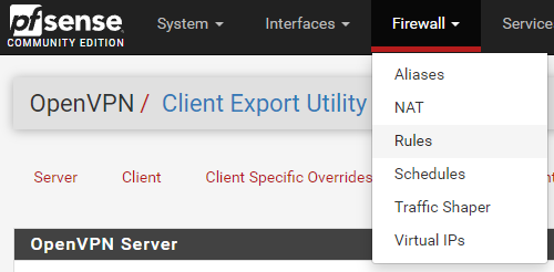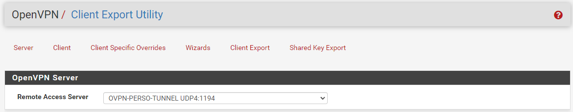 Sur pfSense l'export s'effectue depuis le menu VPN > OpenVPN. Si vous n'avez pas le menu Client Export, alors il faut procéder