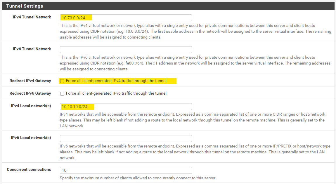 Pour passer en mode full tunneling, cochez la case Redirect IPv4 Gateway (pas utile dans la majorité des cas).