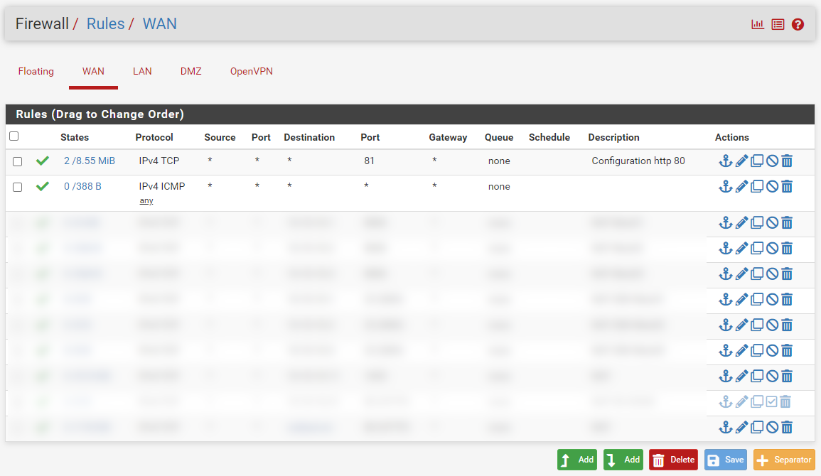 Pour ajouter des règles : Firewall > Rules > WAN et cliquez sur + Add.