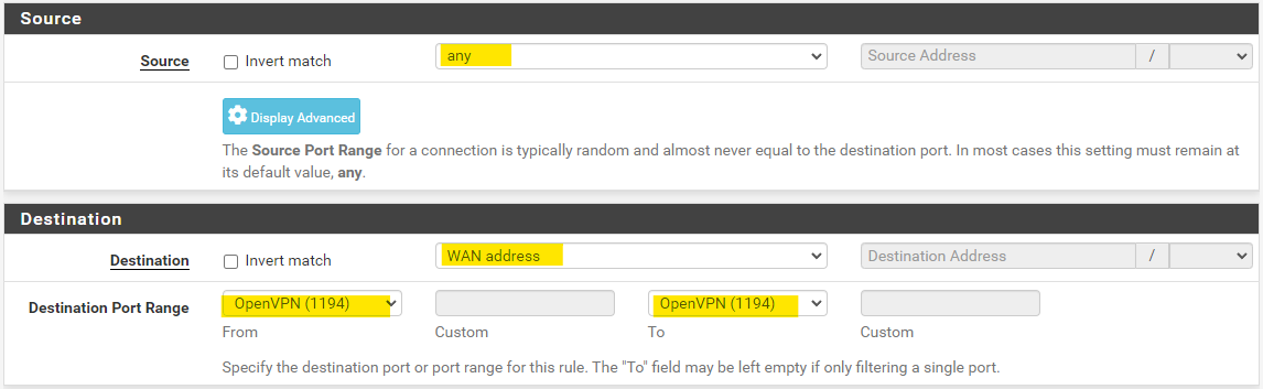 L'objectif est de laisser passer n'importe quelle source arrivant sur l'adresse WAN du firewall et se présentant avec le port 1194.