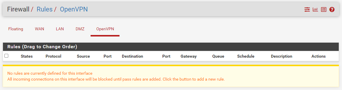 le flux OpenVPN à traverser. Pour cela, allez sur Firewall > Rules > OpenVPN et faites Add.