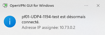 Lorsque vous établissez la connexion depuis OpenVPN Gui (dans la barre de systray), après quelques secondes vous obtenez
