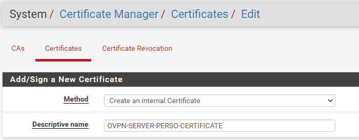 Laisez la méthode à "Create an internal Certificate" et renseignez le nom du certificat serveur. Celui-ci sera également utile