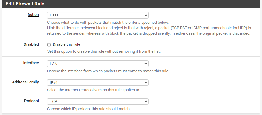 une règle en fin de liste et nous assurons que nous traitons bien sur l'interface LAN, en IPv4 et avec le protocole TCP.