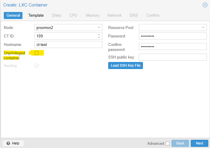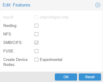 Durant la création du container, il faut décocher la case Unprivileged container