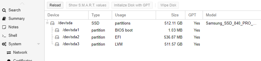 Revenez ensuite sur la page de la GUI de Proxmox, rechargez la page des disques pour le noeud en cours