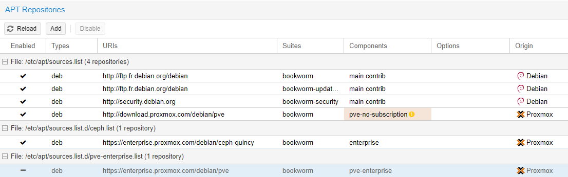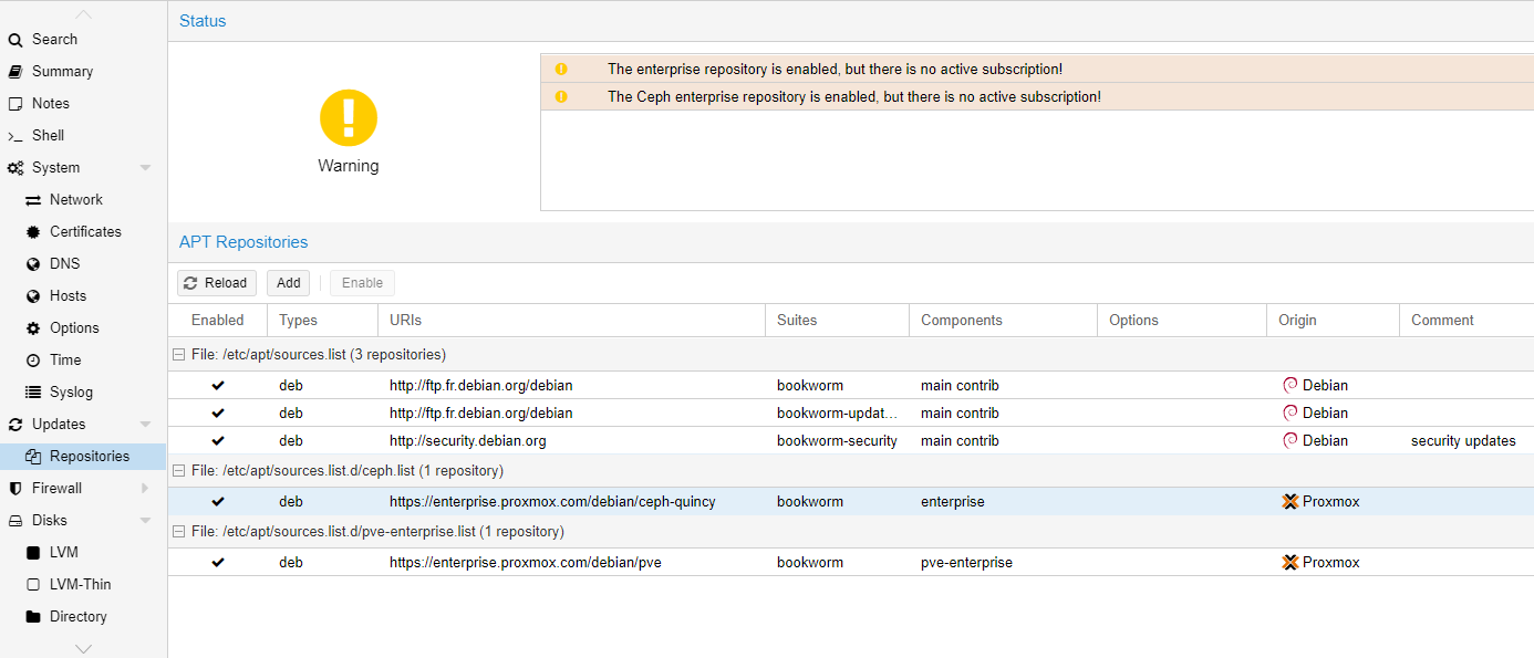 Proxmox est par défaut configuré pour récupérer les mises à jour des packages Entreprise mais cela requiert une licence que nous ne